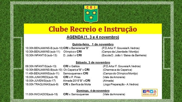 09:30h INFANTIS(sub-13) CRI x Galitos (P.D.Artur F. Gouveia/A.Vedros) 10:30h BENJAMINS-B(sub-10) Ch.Caparica"B" x CRI (Charmeca Caparica) 11:45h BENJAMINS(sub-11) Samouquense x CRI (Campo do Olímpico/Montijo) 15:00h JUNIORES(sub-19) CRI x P. Pires (Vale da Amoreira) 15:00h JUVENIS(sub-17) Almada 2015"B" x CRI (Almada) 15:00h TRAQUINAS(sub-9) CRI x Benfica da Moita (Jogo Preparação - A.Vedros)