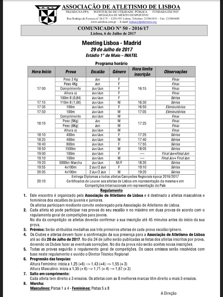 Observações: O Centro de Atletismo da Baixa da Banheira vai estar representado com 3 atletas que iram participar nas seguintes provas: Wilson Pedro - 100m Bernardo Oliveira - Lançamento peso João Pinel - 5000m marcha