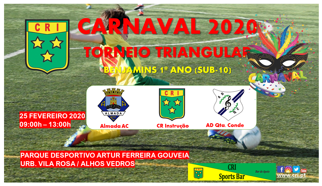 O Clube Recreio e Instrução organiza no dia 25 de Fevereiro o Torneio Triangular de Carnaval em futebol de 7 no escalão de Benjamins de 1º Ano (Sub-10) para jovens nascidos em 2010 e 2011.