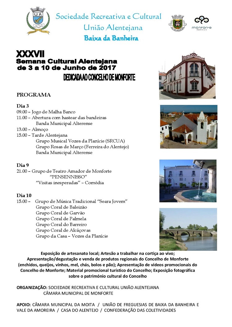 Promovida pela Sociedade Recreativa e Cultural União Alentejana, a XXXVIII Semana Cultural Alentejana irá ter, entre outras actividades, o Desfile de Grupos Corais Etnográficos e Musicais.