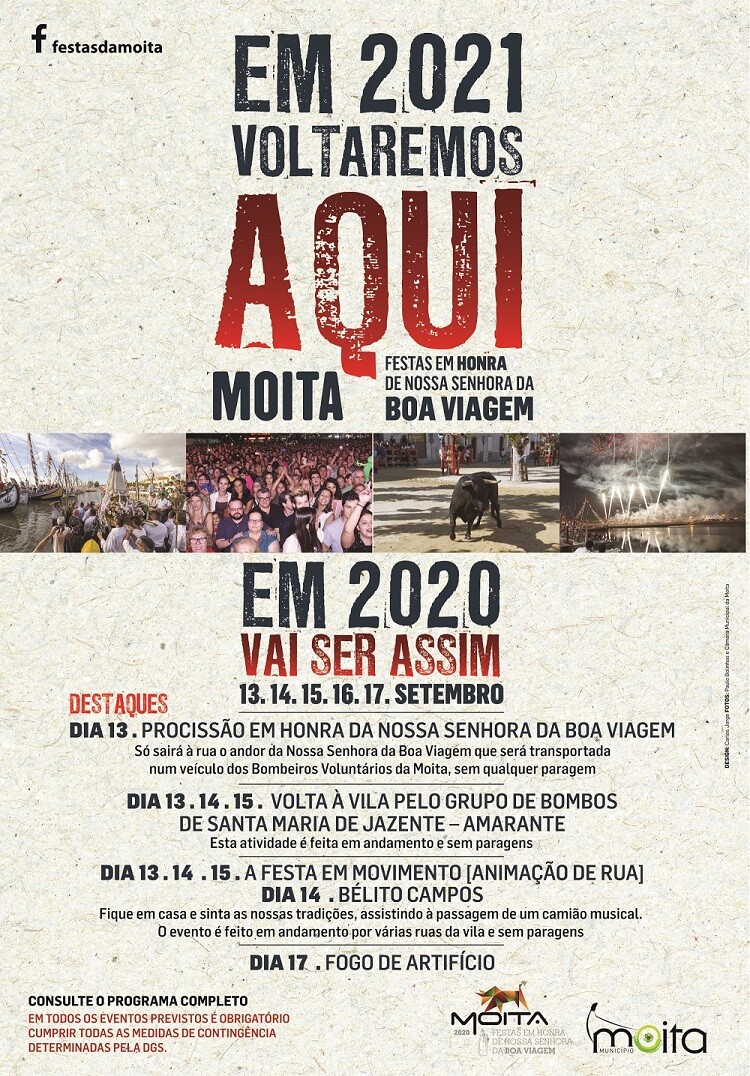 O programa, adequado às circunstâncias atuais e de acordo com as regras da Direção Geral de Saúde, inclui, entre outras iniciativas, a Exposição de Embarcações Típicas do Tejo Engalanadas, no Cais da Moita, as atuações móveis do Grupo de Bombos de Santa Maria de Jazente (Amarante), a Procissão em Honra de Nossa Senhora da Boa Viagem, a Cerimónia Comemorativa do Dia do Município e as Corridas de Toiros na Praça Daniel do Nascimento.
