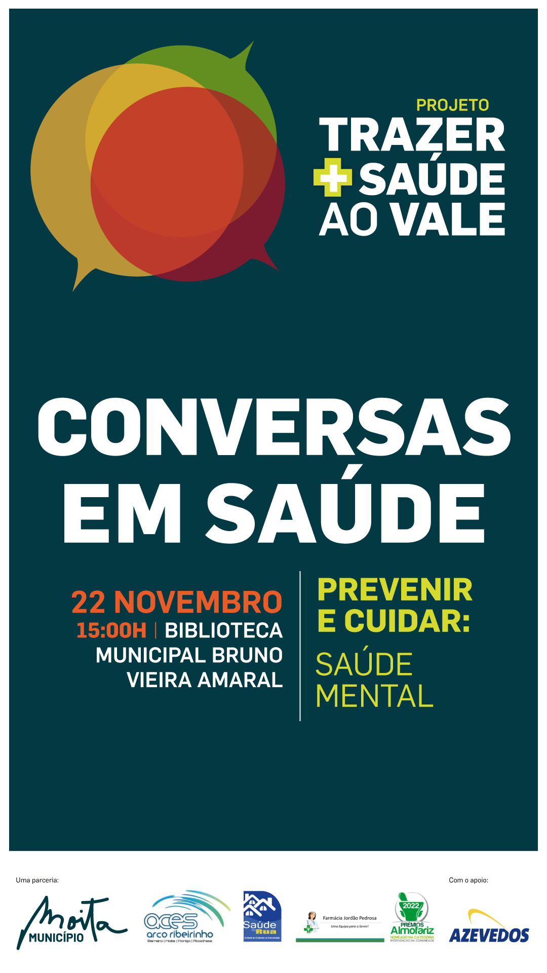 No próximo dia 22 de novembro, quarta-feira, pelas 15:00h participe numa conversa sobre saúde mental, inserida no projeto "Trazer + Saúde ao Vale", esta sessão parte de uma parceria entre a Câmara Municipal da Moita, a Farmácia Jordão Pedrosa, e a Unidade de Cuidados na Comunidade Saúde na Rua do ACES Arco Ribeirinho Sul.
