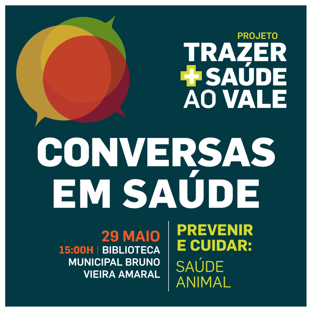 29 maio, 15:00h | Conversas em Saúde | Prevenir e cuidar: Saúde Animal, no auditório da Biblioteca Municipal Bruno Vieira Amaral, no Vale da Amoreira