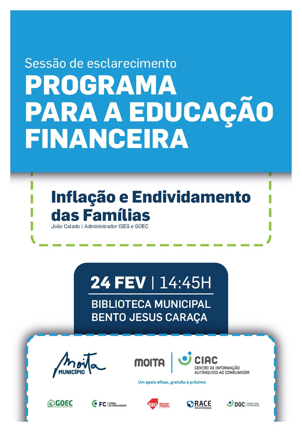 A sessão a realizar no dia 24 de fevereiro, pelas 14:45 horas, no Auditório da Biblioteca Municipal da Moita, irá abordar o tema da Inflação e Endividamento das Famílias e será apresentada por João Calado, administrador ISEG e GOEC.