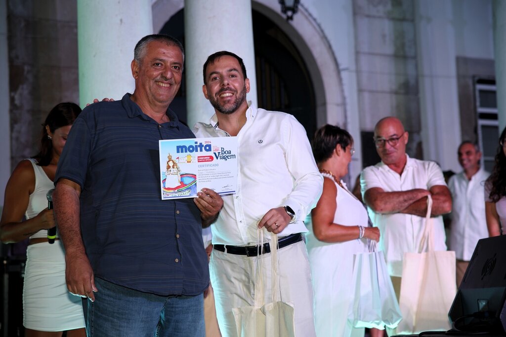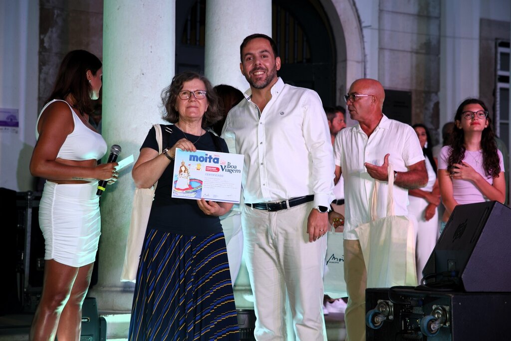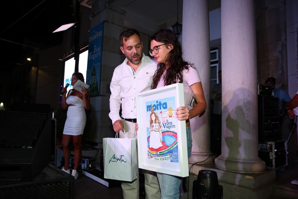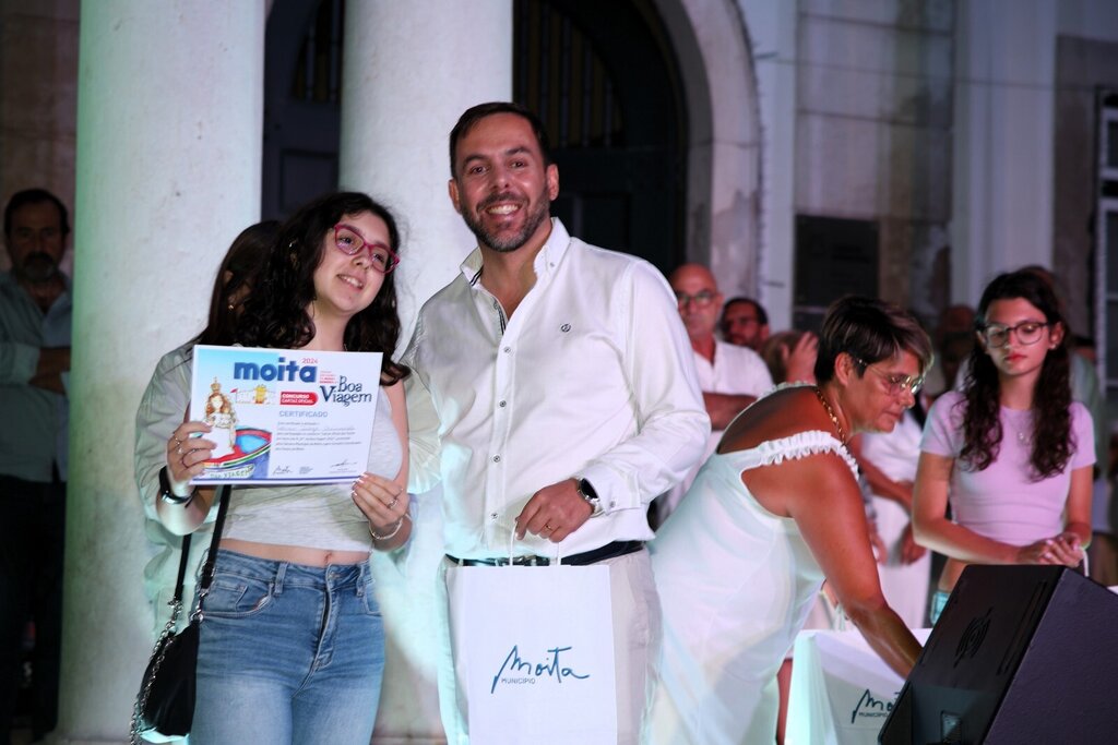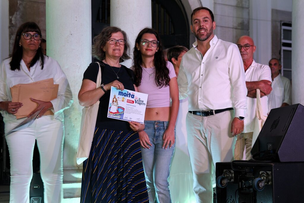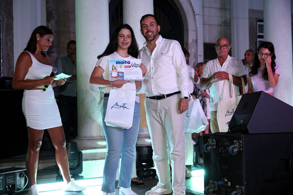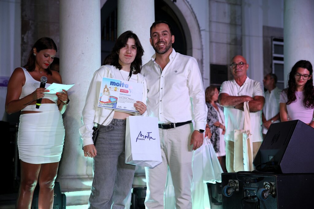 Por volta dessa hora arrancou a cerimónia de entrega do prémio do vencedor do concurso do cartaz oficial para as Festas da Moita 2024. Sara Dimitru foi a vencedora e sentiu-se muito emocionada ao subir ao palco e ver o seu trabalho ser reconhecido e ser o cartaz oficial das Festas deste ano. A jovem aluna do 8º ano da Escola Básica D. Pedro II, da Moita recebeu alguns presentes, um deles, um voucher para viajar no varino O Boa Viagem.