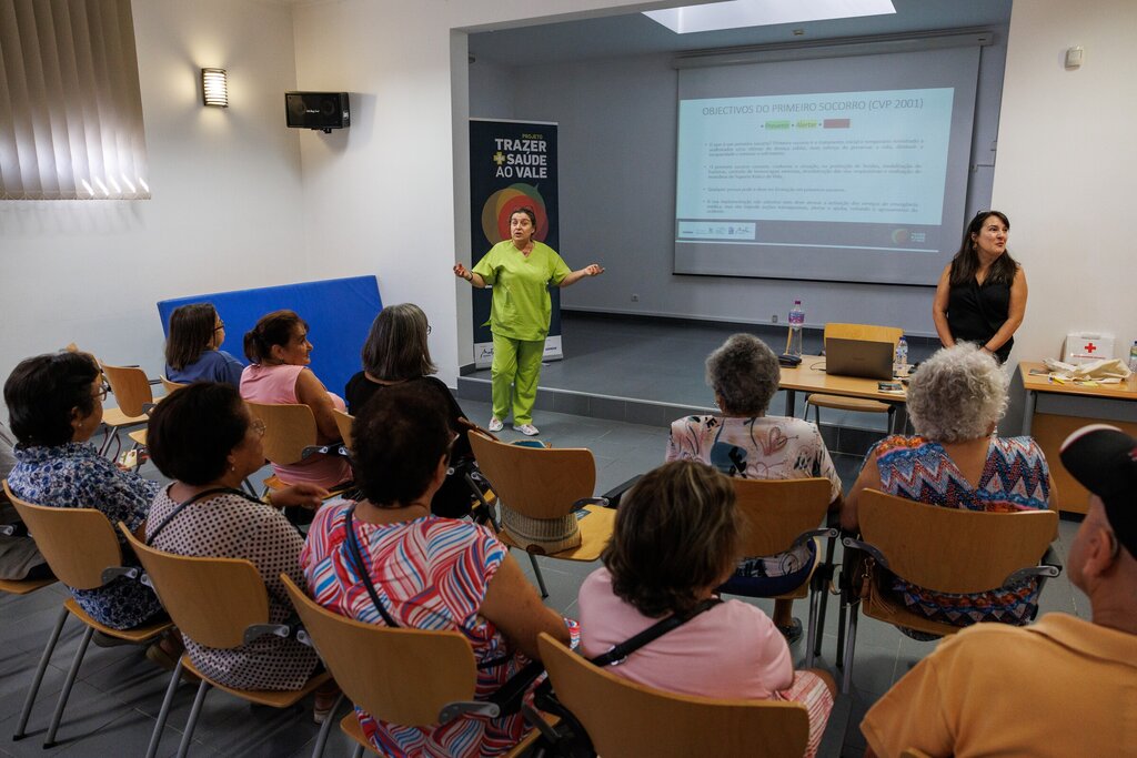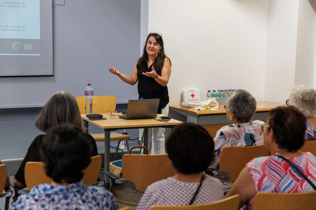 A sessão foi dinamizada pela Dr.ª Dulce Fonseca, Diretora Técnica da Farmácia Jordão Pedrosa e pela Enf.ª Clara Saramago, da UCC “Saúde na Rua” e abordou as seguintes temáticas: quais os objectivos do primeiro socorro, como activar os sistemas de emergência médica, quais os sinais e sintomas da asfixia/sufocação, de corpos estranhos e epistaxis/hemorragia nasal. Foram igualmente abordados os procedimentos a ter em casos de picadas, mordeduras, fraturas, insolação e enregelamento, envenenamento e queimaduras (1.º, 2.º e 3.º grau), perda súbita de consciência e eletrocussão. As recomendações relativas a procedimentos a adoptar na desinfeção de feridas, em casos de hemorragia e em estados de choque.