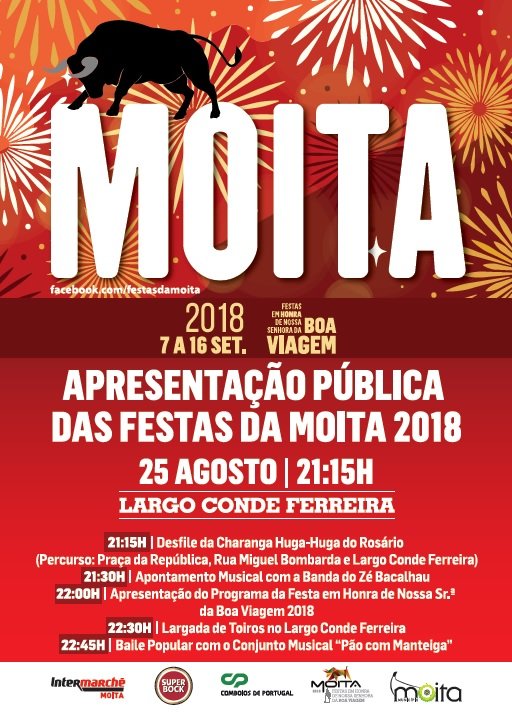 Às 21:15h, a Charanga Huga Huga da Banda Musical do Rosário vai percorrer algumas artérias da vila – Praça da República, Rua Miguel Bombarda e Largo Conde Ferreira –, atraindo a população para o local. Para as 21:30h, está marcado um apontamento musical coma Banda do Zé Bacalhau e, às 22:00h, as principais entidades envolvidas na preparação das Festas da Moita divulgarão o programa e as expetativas para este ano. Esta noite de festa termina com uma largada de toiros e um baile popular com os “Pão com Manteiga, às 22:30h e às 22:45h, respetivamente.