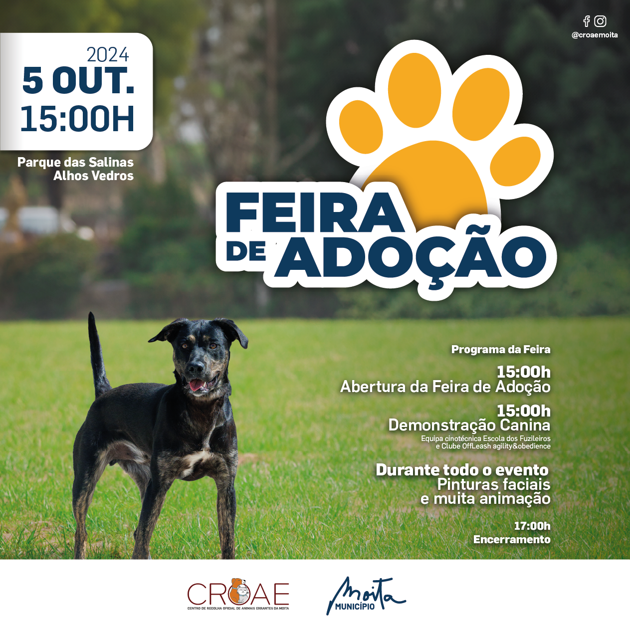 À tarde, o Parque das Salinas acolhe, a partir das 15:00h a Feira de Adoção que irá dar oportunidade aos visitantes de conhecer os animais do CROAE que aguardam uma família. O evento terá início com uma demonstração canina com a equipa cinotécnica Escola dos Fuzileiros e com o Clube OffLeash agility&obedience.