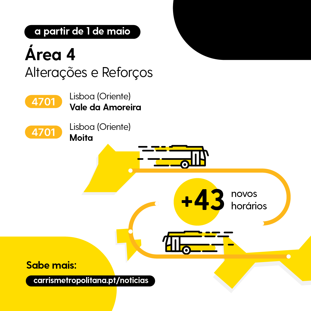No sentido Lisboa (Oriente) os horários das 07h10, 07h20, 07h40 e 07h50 serão transferidos para a 4701 | Lisboa (Oriente) – Vale da Amoreira | Expresso para melhor servir a população da Moita.