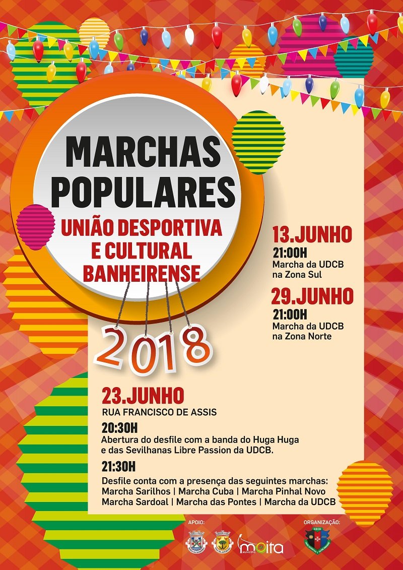 No dia 23 de junho, a partir das 21:30h, as Marchas de Sarilhos Grandes, de Cuba, do Pinhal Novo, do Sardoal, das Pontes e da União Desportiva e Cultural Banheirense, marcha anfitriã, vão desfilar pela Rua Francisco Assis, na Baixa da Banheira.