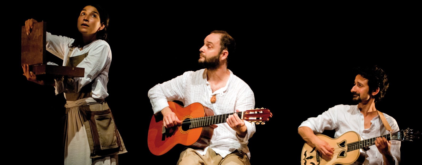 CANÇÕES NÓMADAS é um espetáculo com uma forte componente visual. Com malas e vassouras, peixes de madeira e latas de atum, tijelas e copos de cristal construímos os instrumentos musicais de navegação que nos guiassem nesta partitura itinerante.