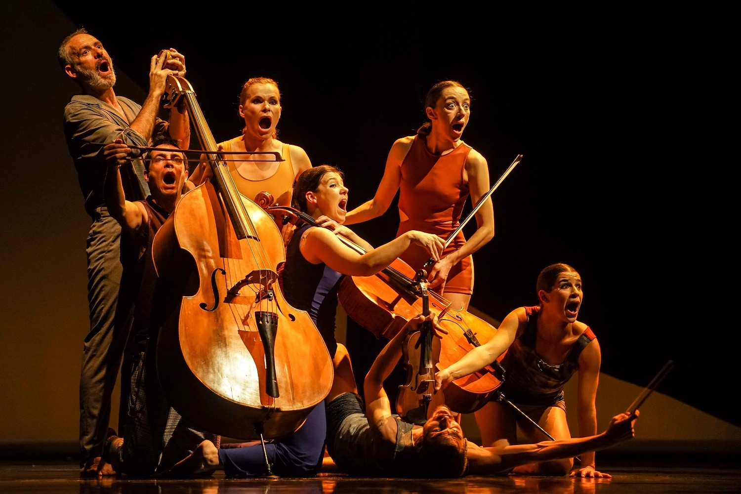 A peça conta com quatro bailarinos e três músicos, com instrumentos de cordas (violino, violoncelo e contrabaixo), onde o ambiente sonoro é feito ao vivo, num entrosamento orgânico entre música e dança.