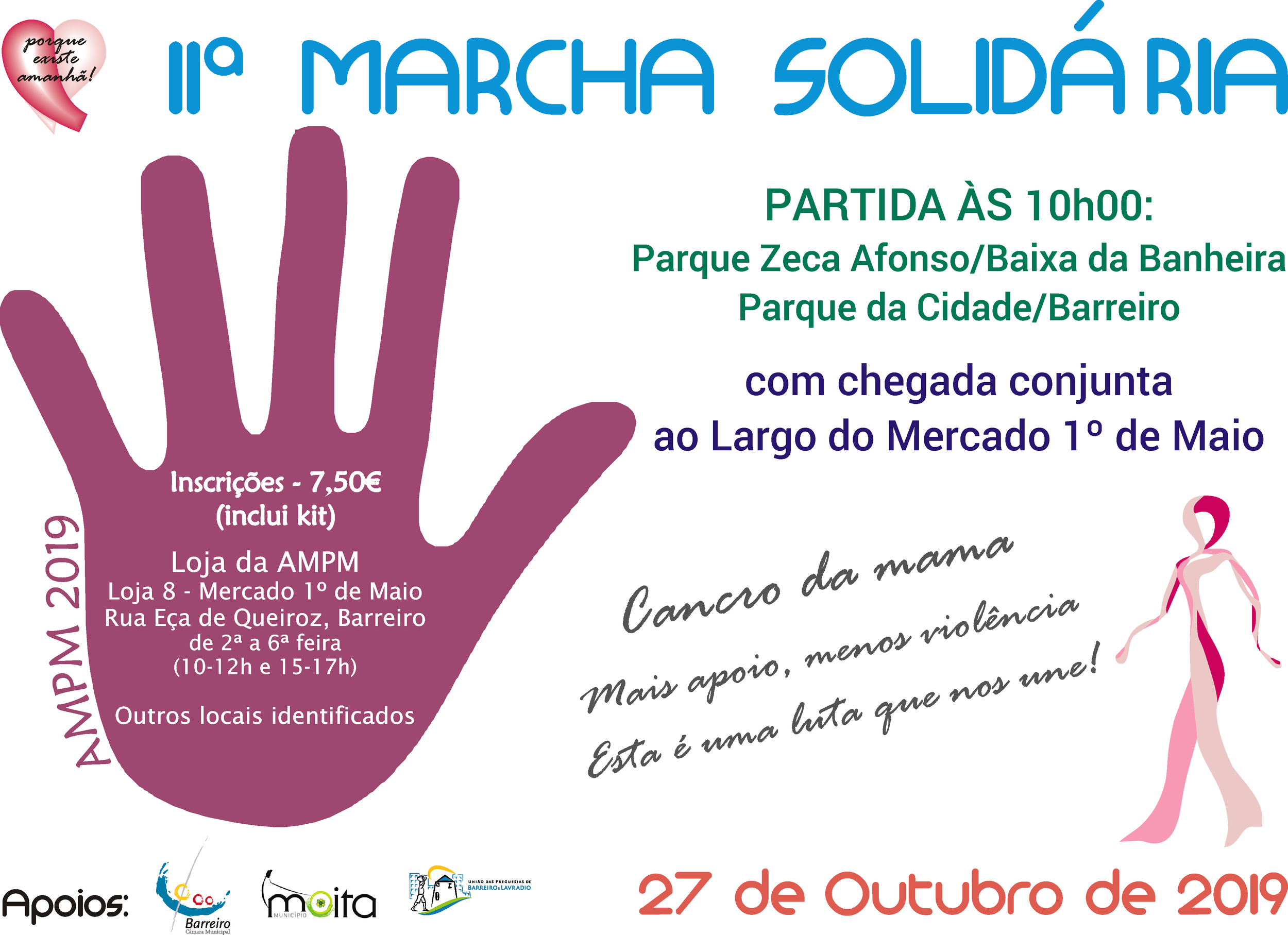 A 11ª Marcha Solidária da AMPM - Associação de Mulheres com Patologia Mamária realiza-se no dia 27 de outubro, a partir das 10:00h, e tem, este ano, como ponto de partida, o Parque José Afonso, na Baixa da Banheira. Organizada no âmbito do Mês da Luta Contra o Cancro, esta marcha, que termina no Largo do Mercado 1º de Maio, no Barreiro, é aberta a toda a população e conta com o apoio da Câmara Municipal da Moita.