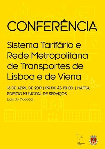 A Área Metropolitana de Lisboa promove, no próximo dia 15 de abril, das 9:00h às 13:00h, no Edifício Municipal de Serviços, em Mafra, a Conferência "Sistema Tarifário e Rede Metropolitana de Transportes de Lisboa e de Viena".
