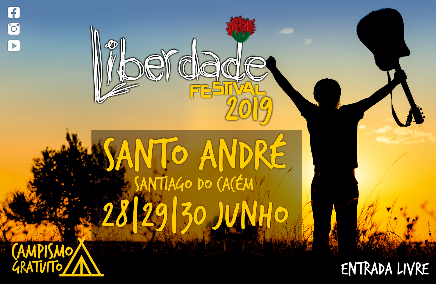 A 7ª edição do Festival Liberdade, promovido pela Associação de Munícipios da Região de Setúbal, realiza-se a 28, 29 e 30 de junho. Esta edição, com mais um dia de evento, irá transformar o Centro Equestre de Santo André, no concelho de Santiago do Cacém, num espaço de convívio, partilha e de encontro da Juventude da Região, com iniciativas nas áreas da música, teatro, cinema, desporto e artes visuais.