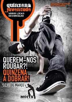 “Querem-nos roubar? Quinzena a dobrar!” são as palavras de ordem da Quinzena da Juventude do concelho da Moita que este ano tem início no dia 2, prolongando-se até 31 de Março. Espera-se um mês de diversão, entretenimento e muita música. aqui o programa