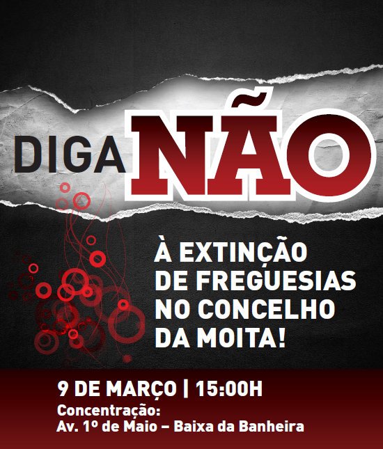 “Diga Não à Extinção de Freguesias no Concelho da Moita!” é uma forma de o Município da Moita e a sua população se manifestarem contra a reforma administrativa autárquica que o atual Governo pretende implementar, colocando em causa o papel do Poder Local Democrático, riscando do mapa mais de 1000 freguesias e retirando, consequentemente, serviços públicos essenciais a milhares de cidadãos.