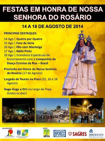 Haverá ainda marchas populares, passagem de modelos e danças sevilhanas e, como é hábito, não vão faltar toiros na praia, com a realização das peculiares largadas ao final da tarde (dias 15, 16 e 18 de agosto), a Tarde do Fogareiro (16 de agosto), nem as cerimónias religiosas em honra da padroeira, com a tradicional procissão (17 de agosto). O Largo da Praia será animado com DJ’s, todas as noites, até às 4:00h. A festa termina no dia 18 de agosto, com um grandioso espetáculo de encerramento com a Companhia de Dança Estrelas da Rua, do Brasil, e o Adeus ao Huga.