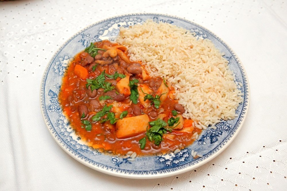 Quando o tomate estiver cozido, juntam-se os chocos e deixam-se cozer. Depois junta-se o feijão cozido e um pouco de caldo da cozedura do mesmo e deixa-se ferver novamente, para apurar. Tempera-se com sal e piripiri. Manda a tradição que esta feijoada seja acompanhada com arroz.