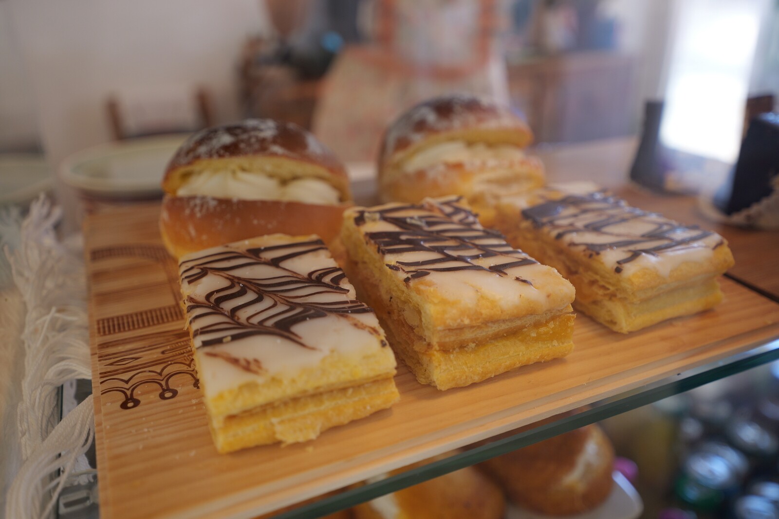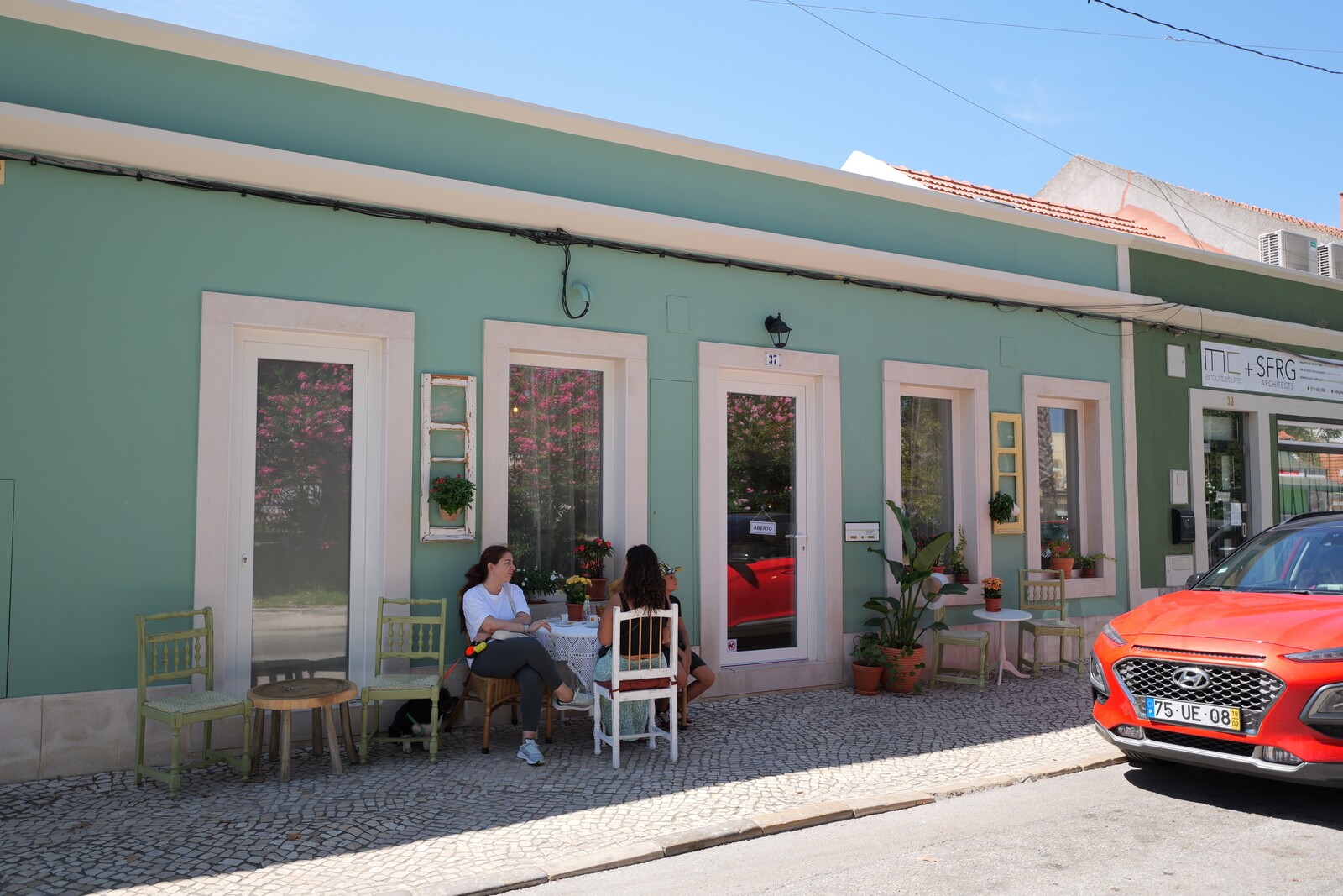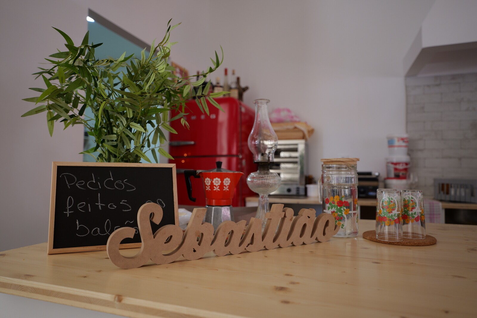 Decorado pelas duas irmãs, este espaço prima pela mistura de vários elementos. Tão depressa vai sentir-se no Alentejo olhando para os bordados típicos das avós, como vai sentir-se em Itália pelo lado contemporâneo do espaço, ou facilmente transporta-se para a Grécia, com o uso das madeiras. “O que mais queremos é que as pessoas sintam que abrimos a porta de nossa casa. Este espaço está decorado tal como eu e a minha irmã temos as nossas casas. Emocionei-me, aliás, quando o meu sobrinho de 11 anos entrou aqui, antes da inauguração e disse que a pastelaria parecia a casa da mãe e da tia Sónia”, explica-nos Sónia Mota. “Temos aqui peças que eu restaurei, outras que nos foram dadas por amigos. As portas que estão penduradas são de casas com mais de 100 anos aqui na Moita, e os pés das nossas mesas são de uma pastelaria com mais de 100 anos do Porto. Não podia ser doutra forma, isto somos nós”, assegura Sónia.