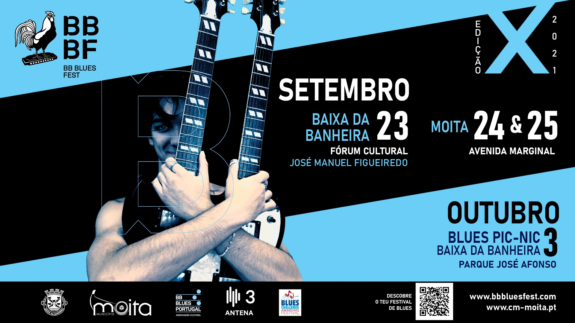 Nos dias 23, 24 e 25 de setembro e 3 de outubro, o BB Blues Fest regressa ao concelho da Moita. Na sua 10ª edição, o festival surge com um novo palco, na Moita, que permite a realização dos concertos com toda a segurança no que respeita à prevenção da COVID-19.