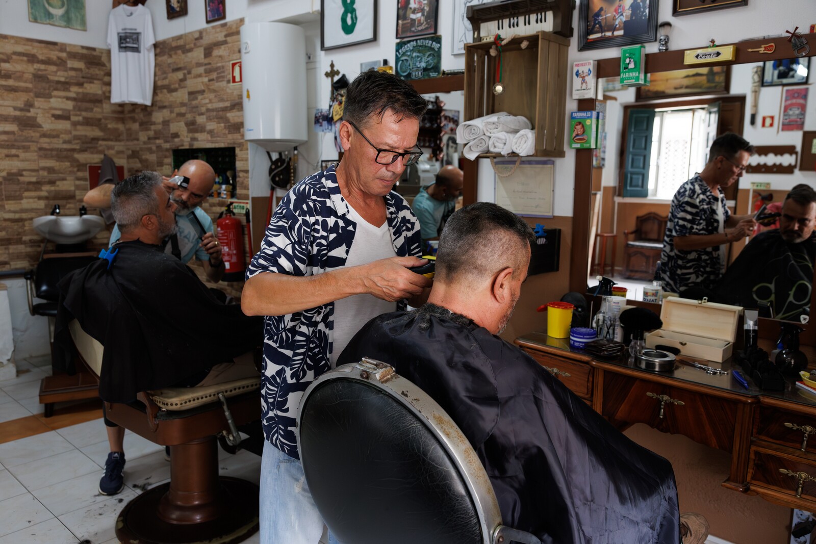 Manuel António é conhecido por Toninho, Rui Silva é apelidado por todos por Teo e juntos são a dupla que pode encontrar na Barbearia O Tesouras, na Baixa da Banheira. Uma equipa que tem uma história ampla, embora só há uns anos tenham voltado a trabalhar juntos neste barbeiro que fica na Rua da Liberdade, na Baixa da Banheira. “Estamos aqui há sete anos, mas vim inicialmente para aqui com outro sócio. Entretanto essa pessoa foi-se embora e eu tive de chamar o meu ponta de lança, o Rui, com quem já tinha trabalhado muitos anos e com quem o negócio funciona sempre”, assume Toninho.