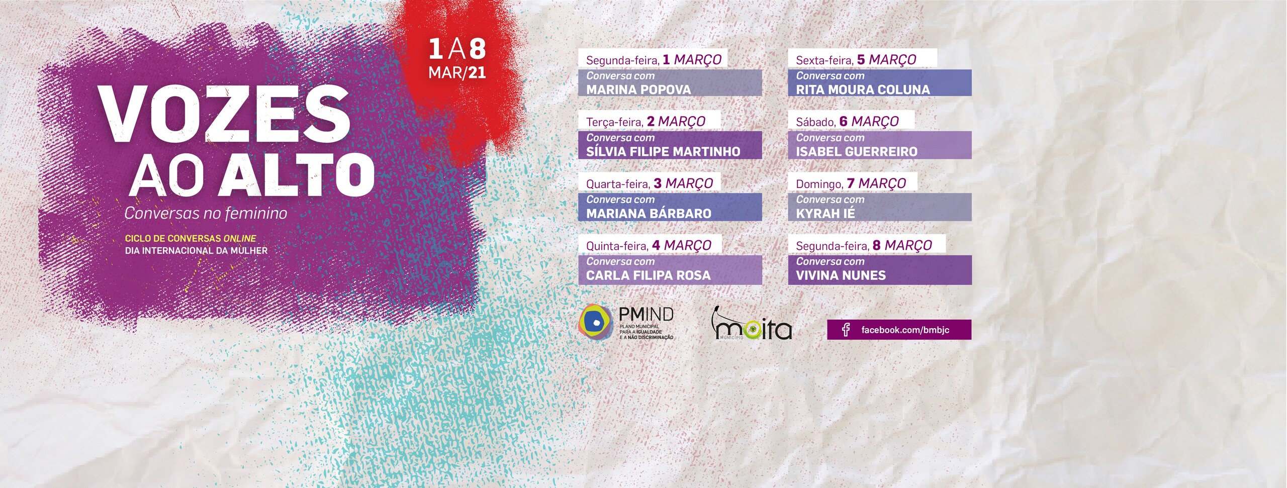 Estas conversas e reflexões com oito mulheres convidadas pela Câmara Municipal da Moita vão abordar temas fraturantes no atual contexto que o País e, naturalmente, o concelho da Moita vivem: a conciliação entre a vida profissional, a vida familiar e o teletrabalho, a situação social das mulheres na atual conjuntura, a precariedade do mercado de trabalho, a criatividade e a arte em tempos de pandemia, as migrações, entre outros temas. Expor ideias, interrogar a realidade e oferecer diferentes olhares sobre estas importantes temáticas são os objetivos da iniciativa que visa igualmente contribuir para o debate e análise de um futuro em que todos e todas são chamados/as a participar.