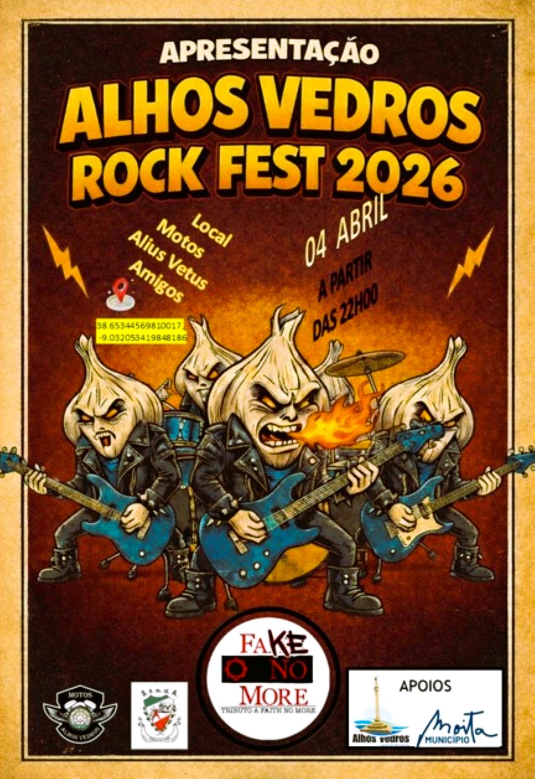 No dia 4 de abril, pelas 20:00 horas, a Motos Alius Vetus apresenta a nova edição do Alhos Vedros Rock Fest 2026, na sede da associação.