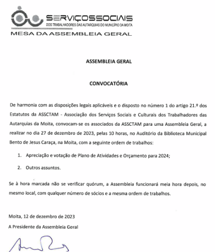 A próxima Assembleia Geral dos Serviços Sociais dos Trabalhadores das Autarquias do Município da Moita está marcada para dia 27 de dezembro, pelas 10:00h, no Auditório da Biblioteca Municipal Bento de Jesus Caraça, na Moita.