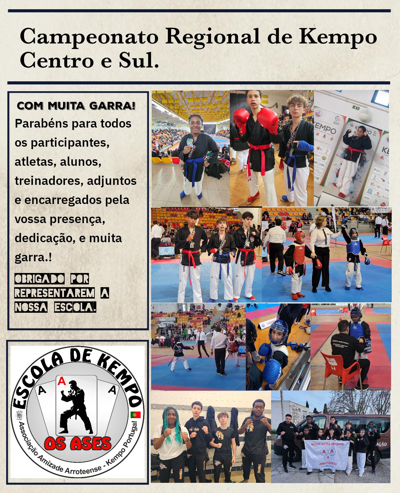 Nos dias 8 e 9 de março, a Associação de Amizade Arroteense esteve presente no Entroncamento, no Campeonato Regional de Kempo Centro e Sul, com a Classe de Competição da escola de kempo "Os Ases", demonstrando as suas capacidades de treino e coragem.