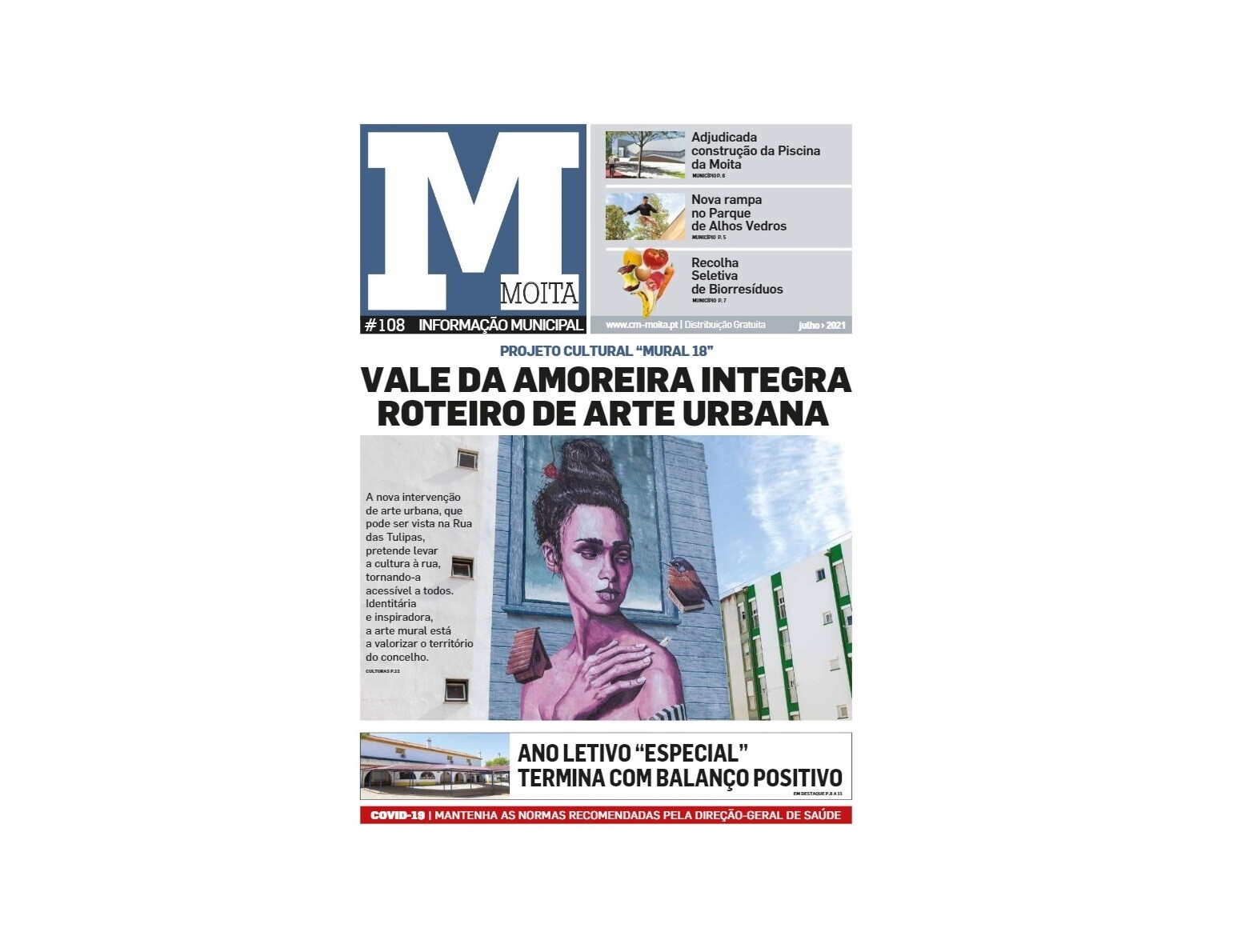 A integração do Vale da Amoreira no roteiro de Arte Urbana do Projeto Cultural “Mural 18”, a adjudicação da construção da Piscina Municipal da Moita, a nova rampa no Parque de Alhos Vedros ou o novo projeto municipal de Recolha Seletiva de Biorresíduos são alguns dos assuntos em destaque nesta edição do Boletim Municipal da Moita, que dá a conhecer os projetos em curso e a atividade do Município nas mais variadas áreas. Nas páginas centrais, a Vereadora da Educação, Vivina Nunes, em entrevista, faz um balanço deste ano letivo “especial”.