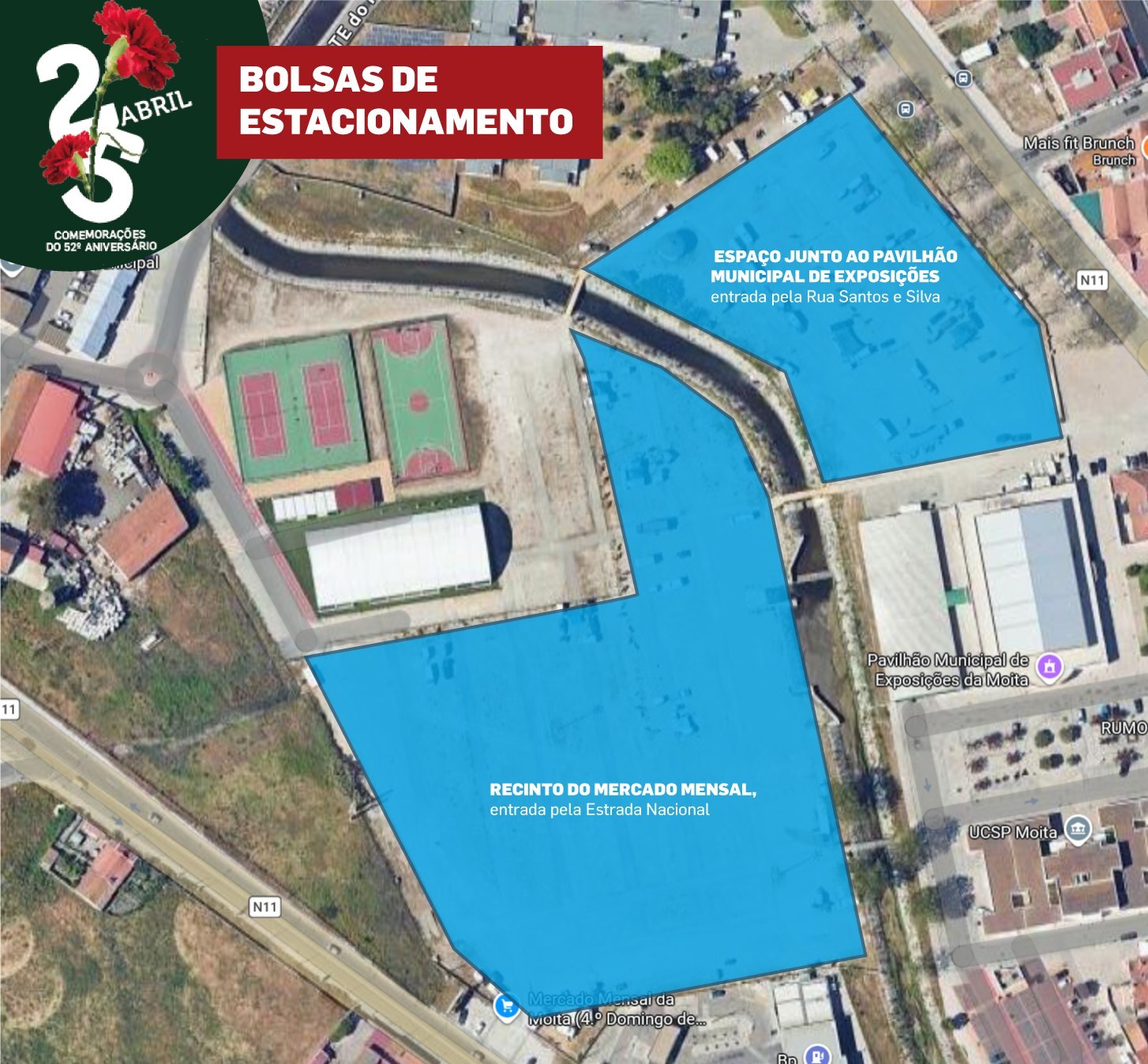 Este condicionamento vai afetar o estacionamento no dia 24 de abril, na freguesia da Moita. As bolsas de estacionamento oficiais são as seguintes: