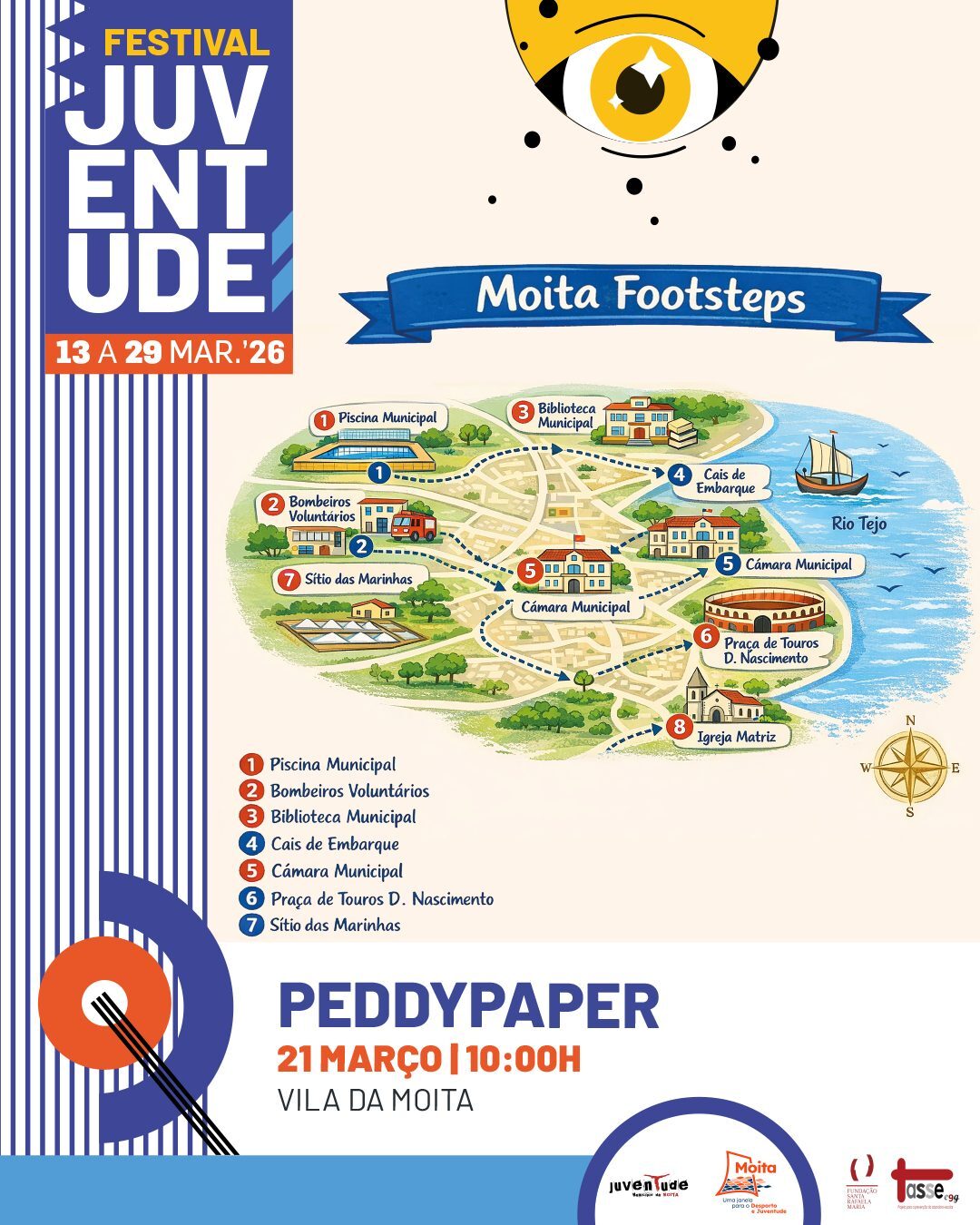 Integrado no Festival da Juventude, o Moita Footsteps é um peddy paper dinâmico e participativo, de percurso livre, que convidou os jovens e suas famílias a descobrir a vila da Moita de forma divertida, educativa e colaborativa.