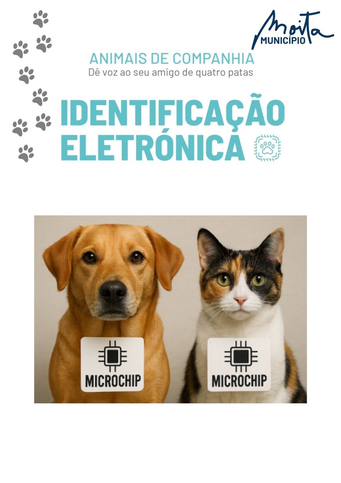 No âmbito da sua estratégia de combate ao abandono animal e de promoção da detenção responsável, o Município da Moita promove uma campanha gratuita de identificação eletrónica de cães e gatos, destinada a munícipes residentes no concelho, a decorrer entre 2 de fevereiro e 30 de abril de 2026.