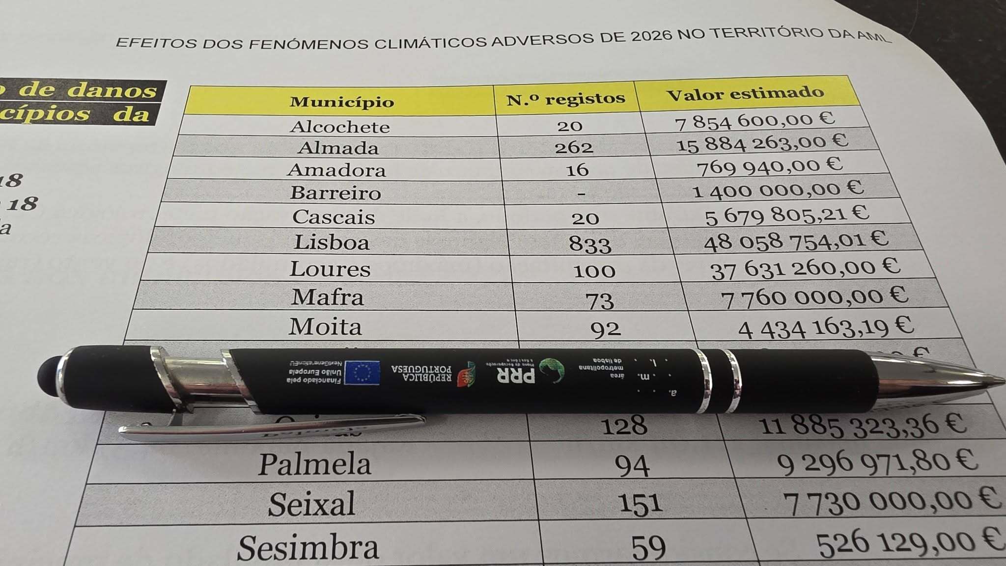 No Município da Moita em concreto foram registadas 92 ocorrências com danos, o que corresponde a um prejuízo estimado de 4.434.163,19 euros